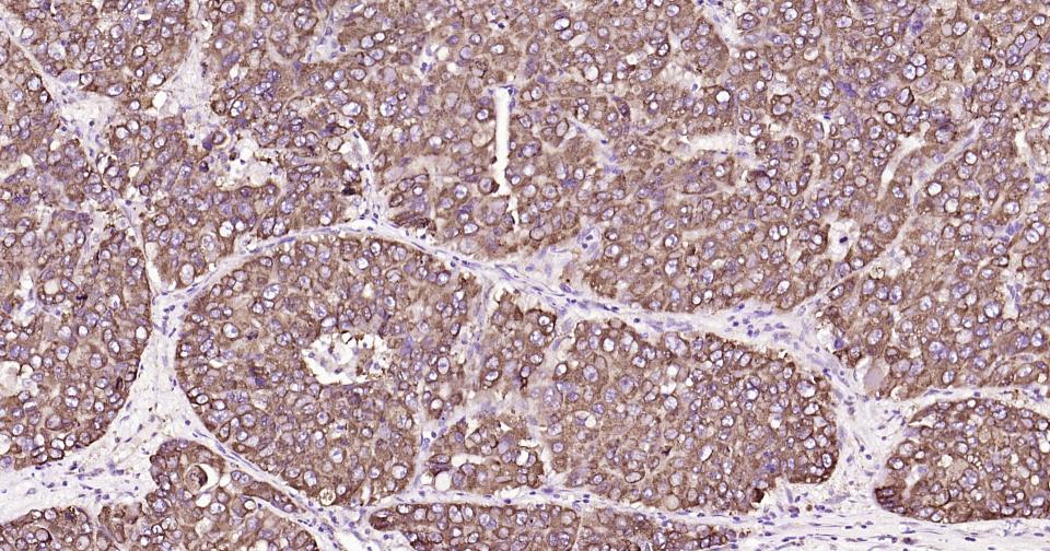 Paraformaldehyde-fixed, paraffin embedded Human Liver Cancer; Antigen retrieval by boiling in sodium citrate buffer (pH6.0) for 15 min; Antibody incubation with Shh Monoclonal Antibody, Unconjugated(bsm-61111R) at 1:200 overnight at 4°C, followed by conjugation to the SP Kit (Rabbit, SP-0023) and DAB (C-0010) staining.