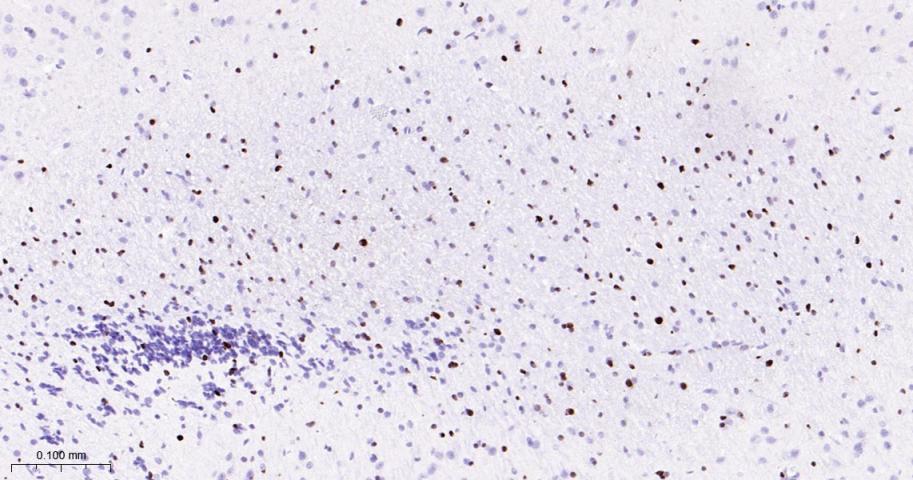 Paraformaldehyde-fixed, paraffin embedded Mouse Cerebrum; Antigen retrieval by boiling in sodium citrate buffer (pH6.0) for 15 min; Antibody incubation with OLIG2 Monoclonal Antibody, Unconjugated(bsm-61115R) at 1:200 overnight at 4°C, followed by conjugation to the bs-0295G-HRP and DAB (C-0010) staining.