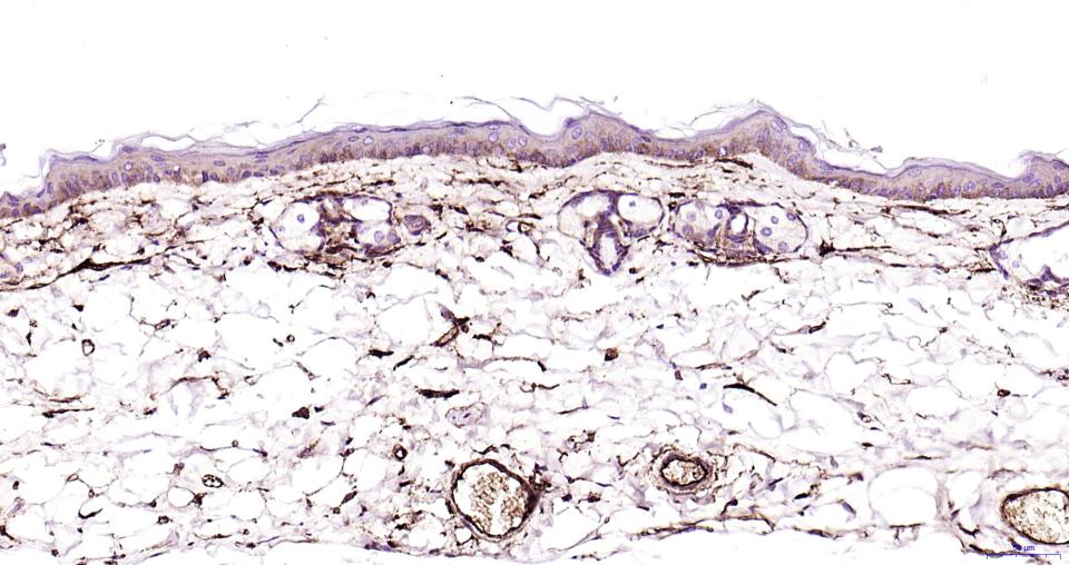 Paraformaldehyde-fixed, paraffin embedded Mouse skin; Antigen retrieval by boiling in sodium citrate buffer (pH6.0) for 15 min; Antibody incubation with Adiponectin  Monoclonal Antibody, Unconjugated (bsm-61121R) at 1:200 overnight at 4°C, followed by conjugation to the bs-0295G-HRP and DAB (C-0010) staining.