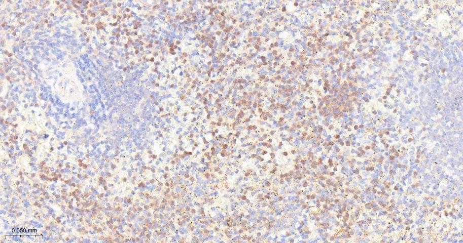 Paraformaldehyde-fixed, paraffin embedded Human Spleen; Antigen retrieval by boiling in sodium citrate buffer (pH6.0) for 15 min; Antibody incubation with API2/BIRC3 Monoclonal Antibody, Unconjugated(bsm-61124R) at 1:100 overnight at 4°C, followed by conjugation to the bs-0295G-HRP and DAB (C-0010) staining.