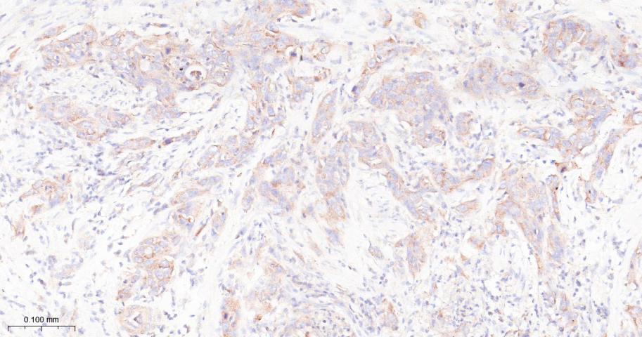 Paraformaldehyde-fixed, paraffin embedded Human Breast Cancer; Antigen retrieval by boiling in sodium citrate buffer (pH6.0) for 15 min; Antibody incubation with API2/BIRC3 Monoclonal Antibody, Unconjugated(bsm-61124R) at 1:100 overnight at 4°C, followed by conjugation to the bs-0295G-HRP and DAB (C-0010) staining.