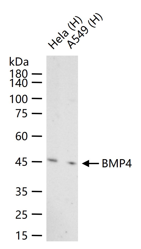 25 ug total protein per lane of various lysates (see on figure) probed with BMP4 monoclonal antibody, unconjugated (bsm-61132R) at 1:2000 dilution and 4°C overnight incubation. Followed by conjugated secondary antibody incubation at r.t. for 60 min.