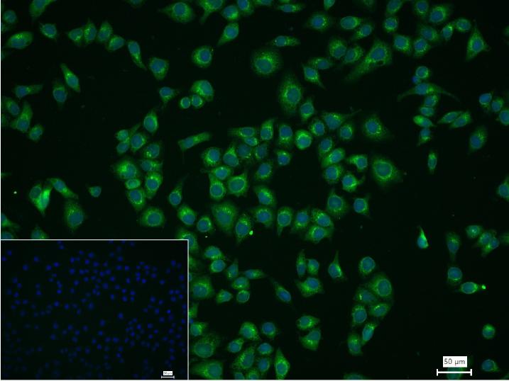 4% Paraformaldehyde-fixed Hela (H) cell; Triton X-100 at r.t. for 20 min; Antibody incubation with (BMP4) monoclonal Antibody, unconjugated (bsm-61132R) 1:100, 90 min at 37°C; followed by conjugated Goat Anti-Rabbit IgG antibody (green, bs-40295G-FITC) at 37°C for 90 min, DAPI (blue, C02-04002) was used to stain the cell nuclei. PBS instead of the primary antibody was used as the blank control.