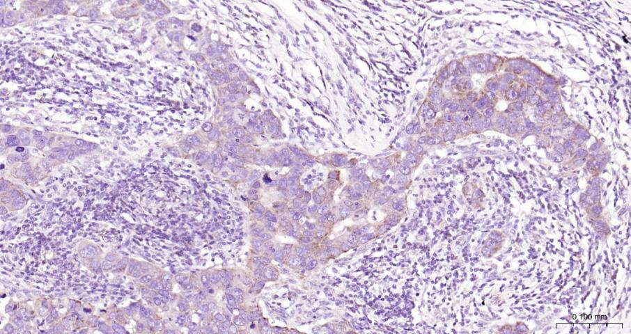Paraformaldehyde-fixed, paraffin embedded Human Breast Cancer; Antigen retrieval by boiling in sodium citrate buffer (pH6.0) for 15 min; Antibody incubation with BMP4 Monoclonal Antibody, Unconjugated(bsm-61132R) at 1:200 overnight at 4°C, followed by conjugation to the bs-0295G-HRP and DAB (C-0010) staining.