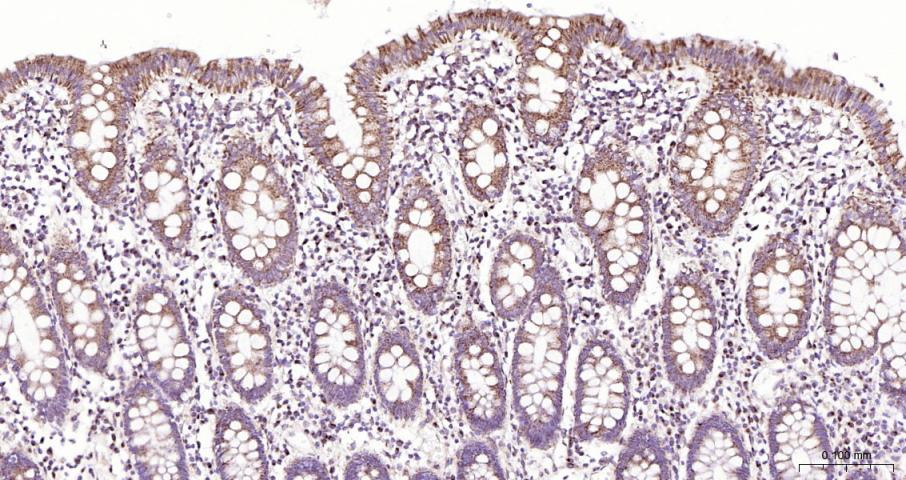 Paraformaldehyde-fixed, paraffin embedded Human colon; Antigen retrieval by boiling in sodium citrate buffer (pH6.0) for 15 min; Antibody incubation with BMP4 Monoclonal Antibody, Unconjugated(bsm-61132R) at 1:200 overnight at 4°C, followed by conjugation to the bs-0295G-HRP and DAB (C-0010) staining.