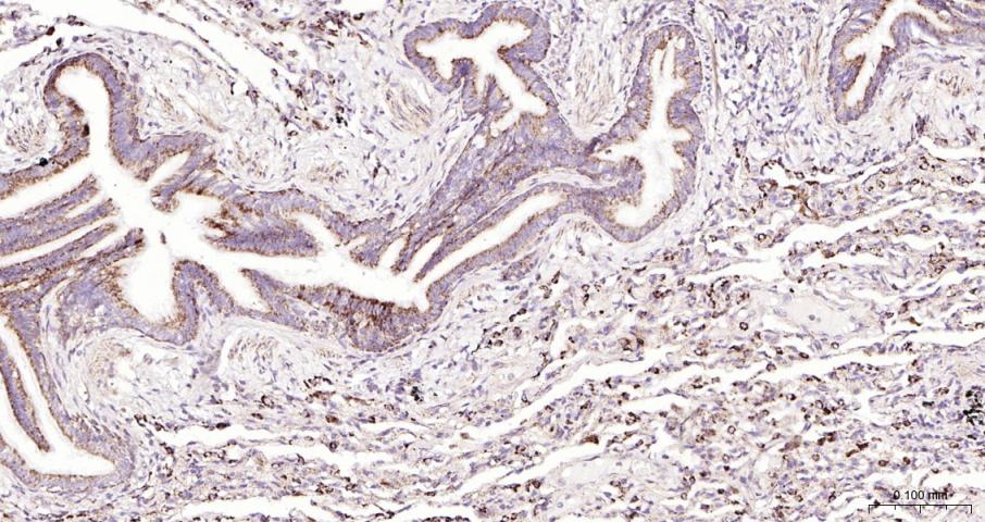 Paraformaldehyde-fixed, paraffin embedded Human lungs; Antigen retrieval by boiling in sodium citrate buffer (pH6.0) for 15 min; Antibody incubation with BMP4 Monoclonal Antibody, Unconjugated(bsm-61132R) at 1:200 overnight at 4°C, followed by conjugation to the bs-0295G-HRP and DAB (C-0010) staining.