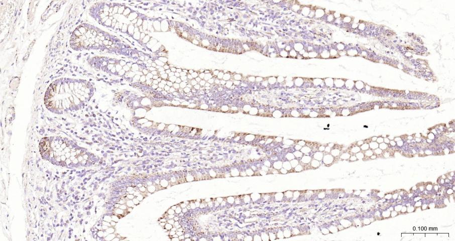Paraformaldehyde-fixed, paraffin embedded Human small intestine; Antigen retrieval by boiling in sodium citrate buffer (pH6.0) for 15 min; Antibody incubation with BMP4 Monoclonal Antibody, Unconjugated(bsm-61132R) at 1:200 overnight at 4°C, followed by conjugation to the bs-0295G-HRP and DAB (C-0010) staining.