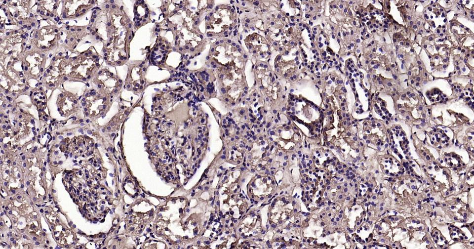Paraformaldehyde-fixed, paraffin embedded Mouse Kidney; Antigen retrieval by boiling in sodium citrate buffer (pH6.0) for 15 min; Antibody incubation with Calmodulin 1 Monoclonal Antibody, Unconjugated(bsm-61141R) at 1:200 overnight at 4°C, followed by conjugation to the SP Kit (Rabbit, SP-0023)and DAB (C-0010) staining.