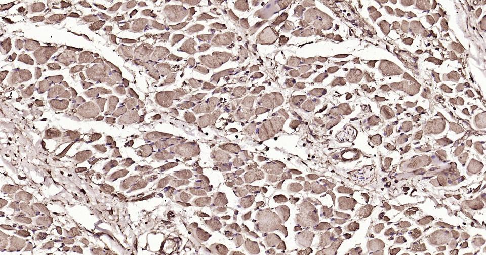Paraformaldehyde-fixed, paraffin embedded Human Skeletal muscle; Antigen retrieval by boiling in sodium citrate buffer (pH6.0) for 15 min; Antibody incubation with Calmodulin 1 Monoclonal Antibody, Unconjugated(bsm-61141R) at 1:200 overnight at 4°C, followed by conjugation to the SP Kit (Rabbit, SP-0023)and DAB (C-0010) staining.