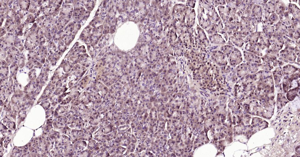 Paraformaldehyde-fixed, paraffin embedded Human Pancreas; Antigen retrieval by boiling in sodium citrate buffer (pH6.0) for 15 min; Antibody incubation with Musashi 1? Monoclonal Antibody, Unconjugated(bsm-61142R) at 1:200 overnight at 4°C, followed by conjugation to the bs-0295G-HRP and DAB (C-0010) staining.