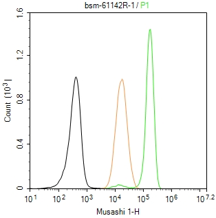 The SH-SY5Y(H) cells were fixed with 4% PFA (10 min at r.t.) and then permeabilized with 90% ice-cold methanol for 20 min at -20℃,the cells then were  incubated in 5%BSA to block non-specific protein-protein interactions (30 min at r.t.), followed by secondary antibody incubation for 40 min at room temperature.Primary Antibody (green):Rabbit Anti-Musashi 1 antibody (bsm-61142R,1:100); Isotype Control (orange): Rabbit IgG (bs-0295P). Blank control (black): PBS. Acquisition of 20,000 events was performed.
