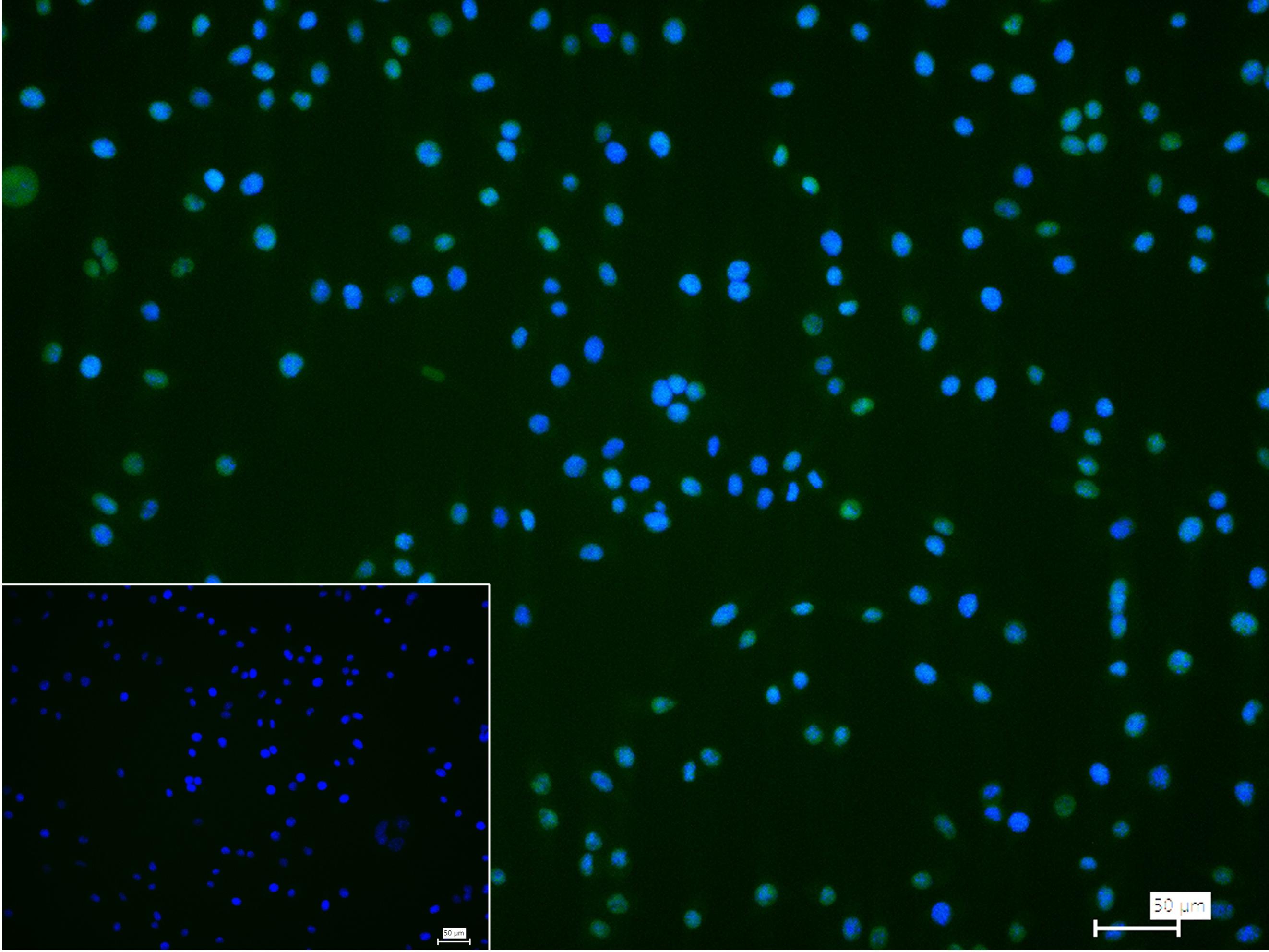 4% Paraformaldehyde-fixed SH-SY5Y (H) cell; Triton X-100 at r.t. for 20 min; Antibody incubation with (Musashi 1) monoclonal Antibody, unconjugated (bsm-61142R) 1:100, 90 min at 37°C; followed by conjugated Goat Anti-Rabbit IgG antibody (green, bs-60295G-BF488) at 37°C for 90 min, DAPI (blue, C02-04002) was used to stain the cell nuclei. PBS instead of the primary antibody was used as the blank control.