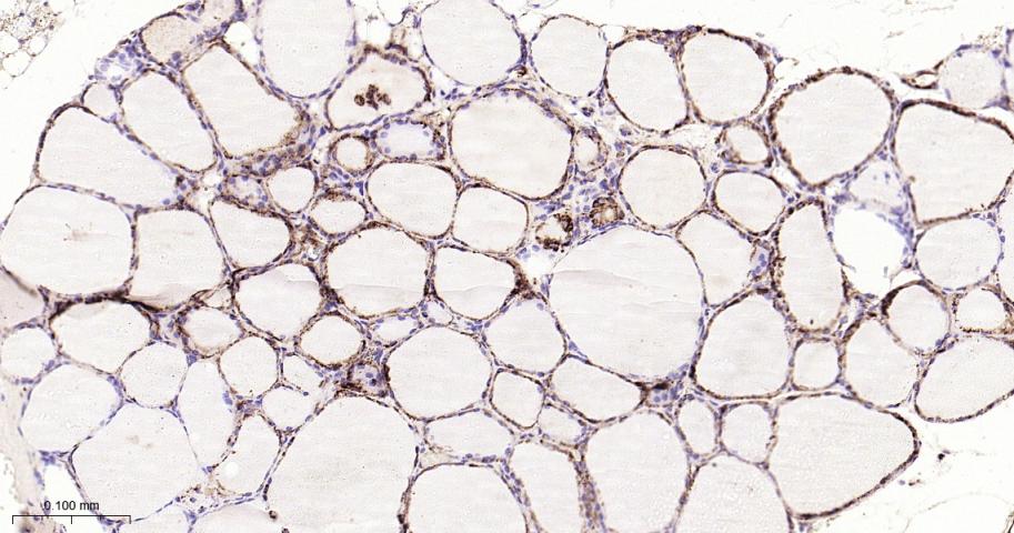 Paraformaldehyde-fixed, paraffin embedded Mouse Thyroid Gland; Antigen retrieval by boiling in sodium citrate buffer (pH6.0) for 15 min; Antibody incubation with Cathepsin D Monoclonal Antibody, Unconjugated(bsm-61164R) at 1:200 overnight at 4°C, followed by conjugation to the bs-0295G-HRP and DAB (C-0010) staining.