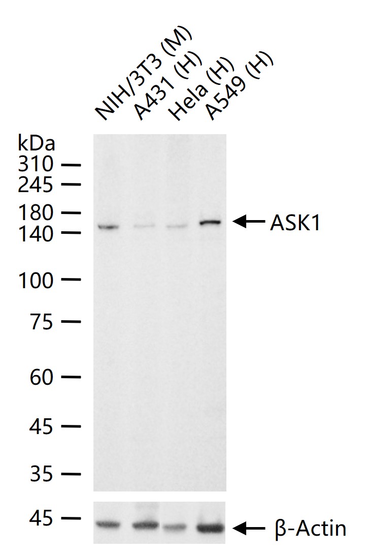 25 ug total protein per lane of various lysates (see on figure) probed with ASK1 monoclonal antibody, unconjugated (bsm-61166R) at 1:2000 dilution and 4°C overnight incubation. Followed by conjugated secondary antibody incubation at r.t. for 60 min.