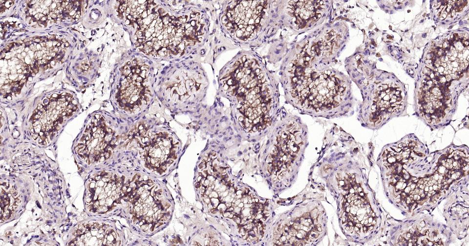 Paraformaldehyde-fixed, paraffin embedded Human Testicles; Antigen retrieval by boiling in sodium citrate buffer (pH6.0) for 15 min; Antibody incubation with ASK1 Monoclonal Antibody, Unconjugated(bsm-61166R) at 1:200 overnight at 4°C, followed by conjugation to the SP Kit (Rabbit, SP-0023)and DAB (C-0010) staining.