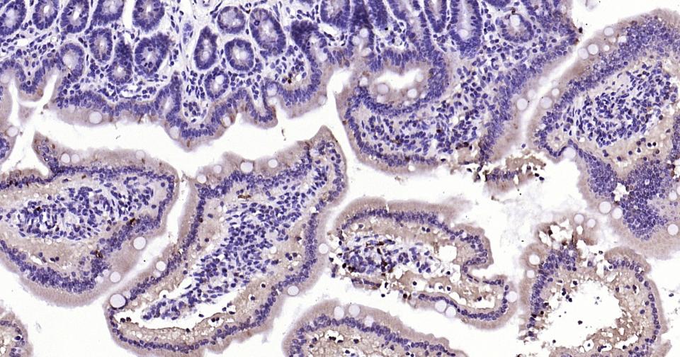 Paraformaldehyde-fixed, paraffin embedded Mouse Small Intestine; Antigen retrieval by boiling in sodium citrate buffer (pH6.0) for 15 min; Antibody incubation with S100A8 Monoclonal Antibody, Unconjugated(bsm-61167R) at 1:200 overnight at 4°C, followed by conjugation to the SP Kit (Rabbit, SP-0023)and DAB (C-0010) staining.