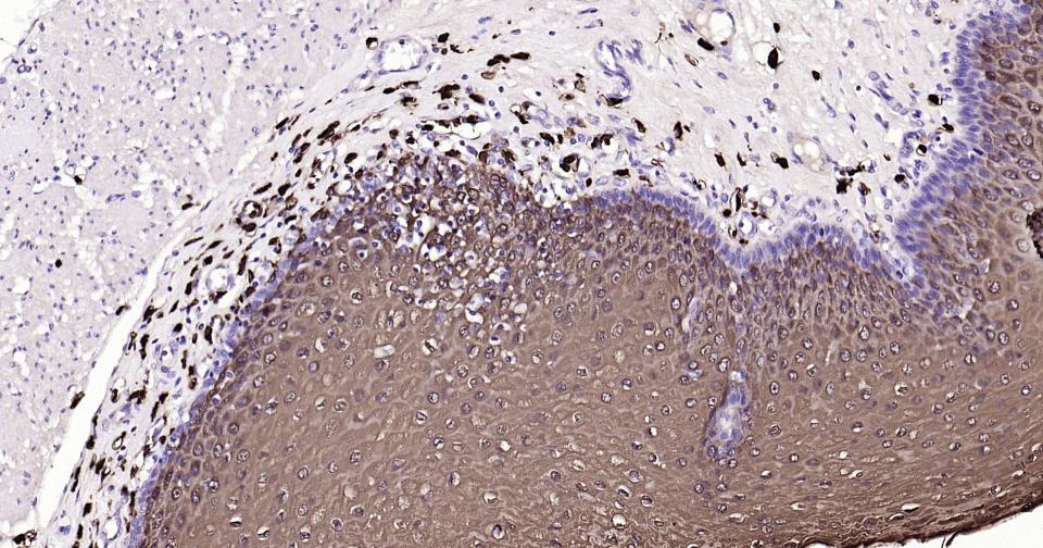 Paraformaldehyde-fixed, paraffin embedded Human Esophagus; Antigen retrieval by boiling in sodium citrate buffer (pH6.0) for 15 min; Antibody incubation with S100A8 Monoclonal Antibody, Unconjugated(bsm-61167R) at 1:200 overnight at 4°C, followed by conjugation to the SP Kit (Rabbit, SP-0023)and DAB (C-0010) staining.
