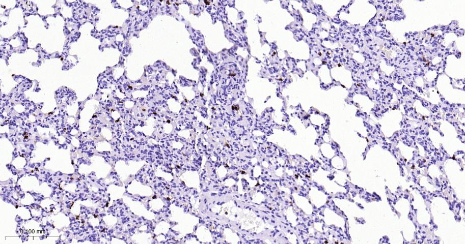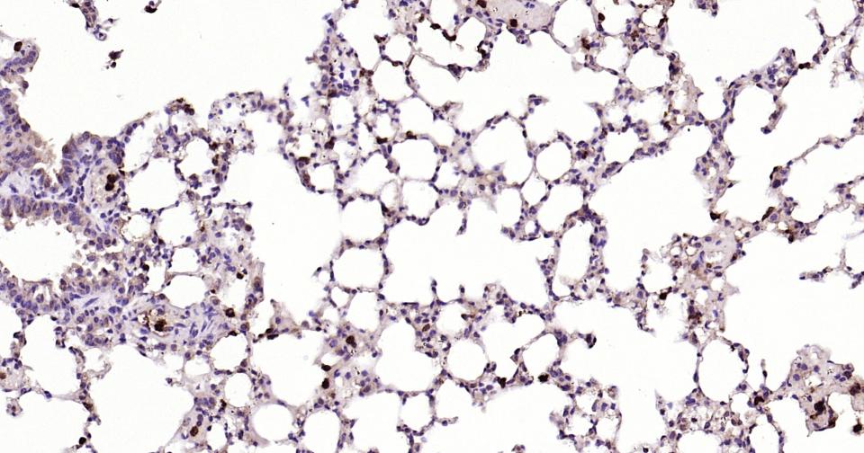 Paraformaldehyde-fixed, paraffin embedded Mouse Lung; Antigen retrieval by boiling in sodium citrate buffer (pH6.0) for 15 min; Antibody incubation with S100A8 Monoclonal Antibody, Unconjugated(bsm-61167R) at 1:200 overnight at 4°C, followed by conjugation to the SP Kit (Rabbit, SP-0023)and DAB (C-0010) staining.