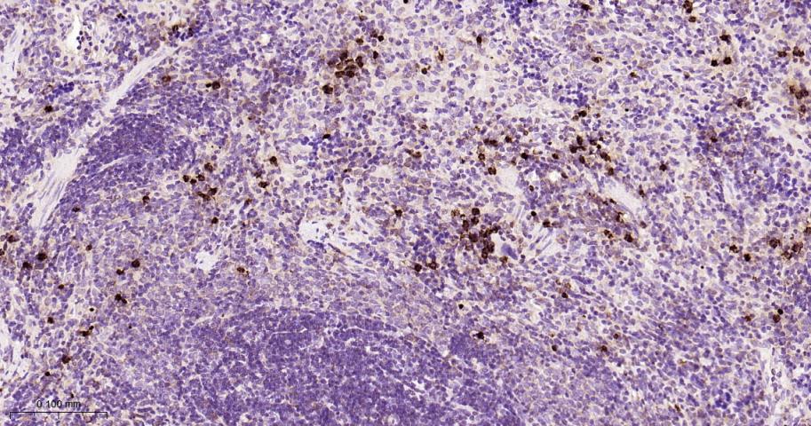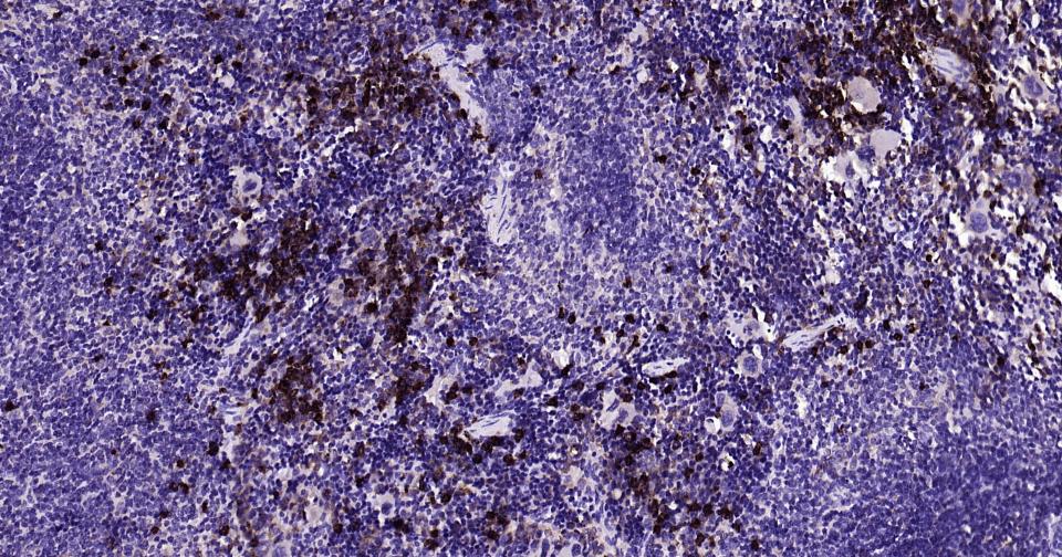 Paraformaldehyde-fixed, paraffin embedded Human Spleen; Antigen retrieval by boiling in sodium citrate buffer (pH6.0) for 15 min; Antibody incubation with S100A8 Monoclonal Antibody, Unconjugated(bsm-61167R) at 1:200 overnight at 4°C, followed by conjugation to the SP Kit (Rabbit, SP-0023)and DAB (C-0010) staining.