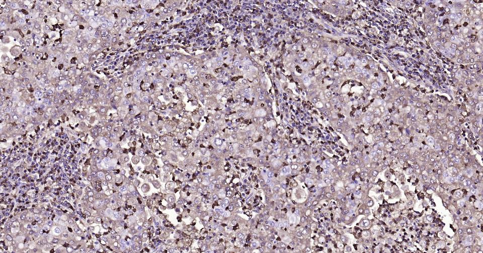 Paraformaldehyde-fixed, paraffin embedded Human Lung Cancer; Antigen retrieval by boiling in sodium citrate buffer (pH6.0) for 15 min; Antibody incubation with S100A8 Monoclonal Antibody, Unconjugated(bsm-61167R) at 1:200 overnight at 4°C, followed by conjugation to the SP Kit (Rabbit, SP-0023)and DAB (C-0010) staining.