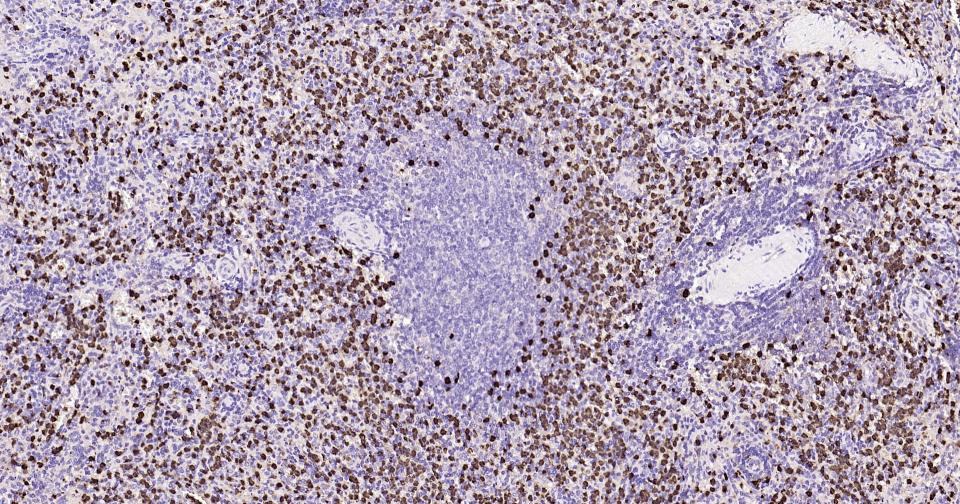 Paraformaldehyde-fixed, paraffin embedded Rat Spleen; Antigen retrieval by boiling in sodium citrate buffer (pH6.0) for 15 min; Antibody incubation with S100A8 Monoclonal Antibody, Unconjugated(bsm-61167R) at 1:200 overnight at 4°C, followed by conjugation to the bs-0295G-HRP and DAB (C-0010) staining.