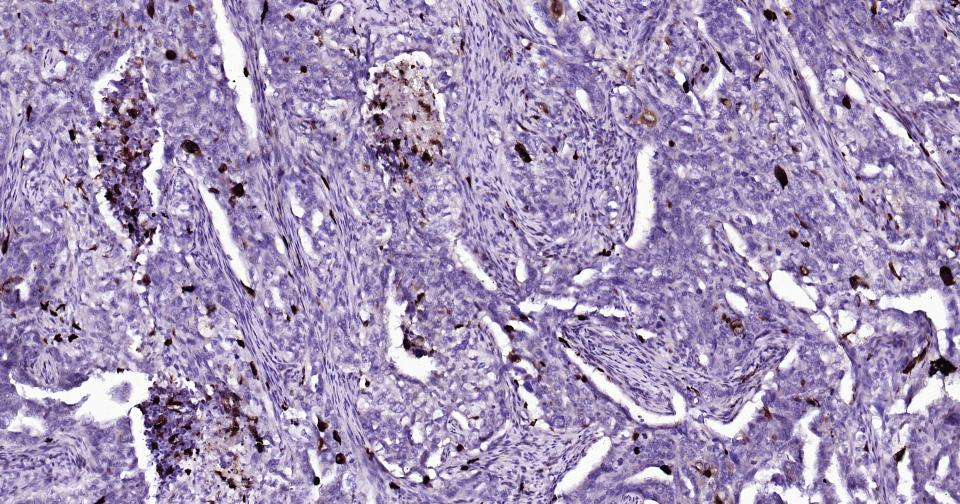 Paraformaldehyde-fixed, paraffin embedded Human Cervical Cancer; Antigen retrieval by boiling in sodium citrate buffer (pH6.0) for 15 min; Antibody incubation with S100A8 Monoclonal Antibody, Unconjugated(bsm-61167R) at 1:200 overnight at 4°C, followed by conjugation to the SP Kit (Rabbit, SP-0023)and DAB (C-0010) staining.