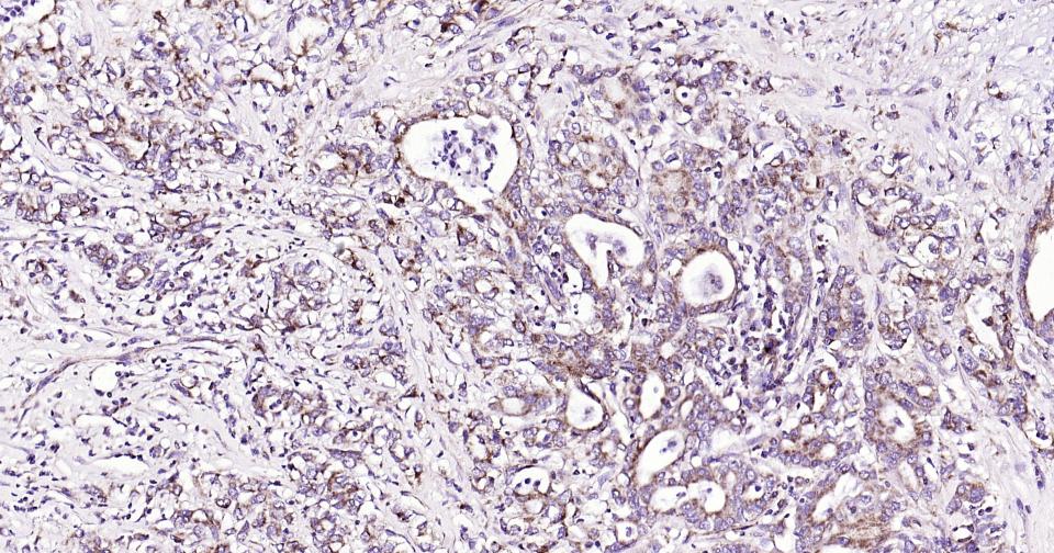 Paraformaldehyde-fixed, paraffin embedded Human Pancreatic Cancer; Antigen retrieval by boiling in sodium citrate buffer (pH6.0) for 15 min; Antibody incubation with Bak Monoclonal Antibody, Unconjugated(bsm-61174R) at 1:200 overnight at 4°C, followed by conjugation to the SP Kit  (Rabbit, SP-0023)  and DAB (C-0010) staining.