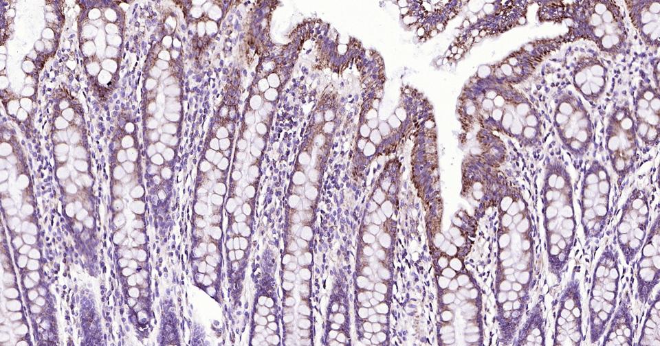 Paraformaldehyde-fixed, paraffin embedded Human Colon; Antigen retrieval by boiling in sodium citrate buffer (pH6.0) for 15 min; Antibody incubation with Bak Monoclonal Antibody, Unconjugated(bsm-61174R) at 1:200 overnight at 4°C, followed by conjugation to the SP Kit  (Rabbit, SP-0023)  and DAB (C-0010) staining.