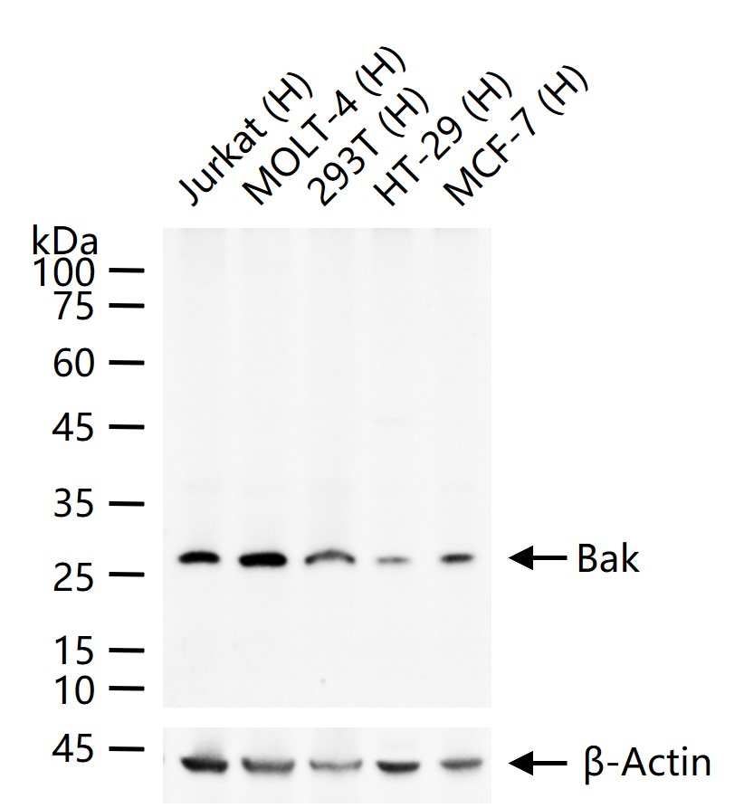25 ug total protein per lane of various lysates (see on figure) probed with Bak monoclonal antibody, unconjugated (bsm-61174R) at 1:2000 dilution and 4°C overnight incubation. Followed by conjugated secondary antibody incubation at r.t. for 60 min.