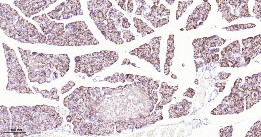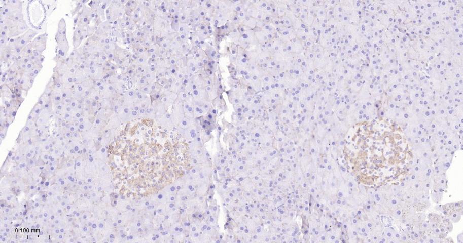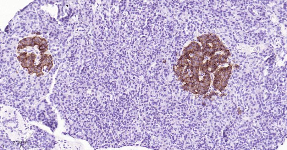 Paraformaldehyde-fixed, paraffin embedded Rat Pancreas; Antigen retrieval by boiling in sodium citrate buffer (pH6.0) for 15 min; Antibody incubation with Somatostatin Receptor 2 Monoclonal Antibody, Unconjugated(bsm-61177R) at 1:200 overnight at 4°C, followed by conjugation to the bs-0295G-HRP and DAB (C-0010) staining.