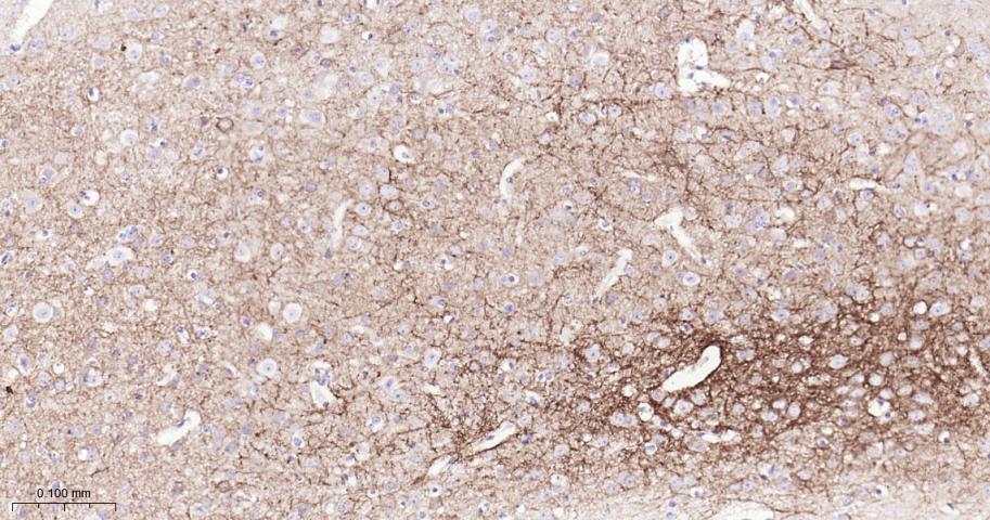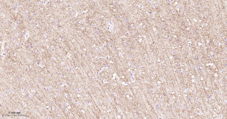 Paraformaldehyde-fixed, paraffin embedded Rat Cerebrum; Antigen retrieval by boiling in sodium citrate buffer (pH6.0) for 15 min; Antibody incubation with Somatostatin Receptor 2 Monoclonal Antibody, Unconjugated(bsm-61177R) at 1:200 overnight at 4°C, followed by conjugation to the bs-0295G-HRP and DAB (C-0010) staining.