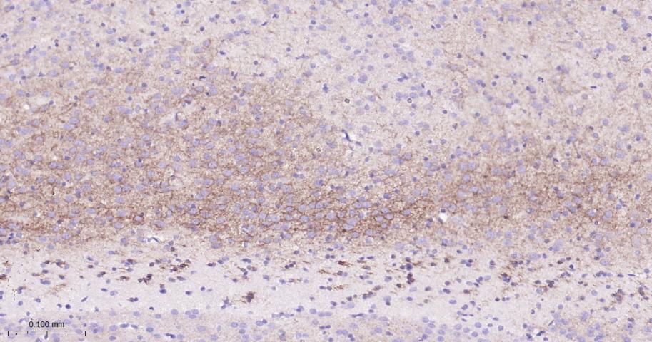 Paraformaldehyde-fixed, paraffin embedded Mouse Cerebrum; Antigen retrieval by boiling in sodium citrate buffer (pH6.0) for 15 min; Antibody incubation with Somatostatin Receptor 2 Monoclonal Antibody, Unconjugated(bsm-61177R) at 1:200 overnight at 4°C, followed by conjugation to the bs-0295G-HRP and DAB (C-0010) staining.