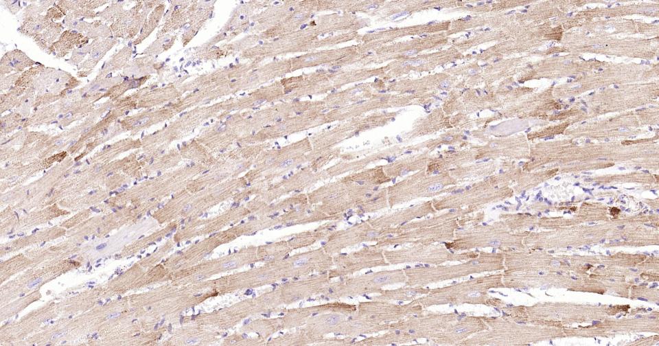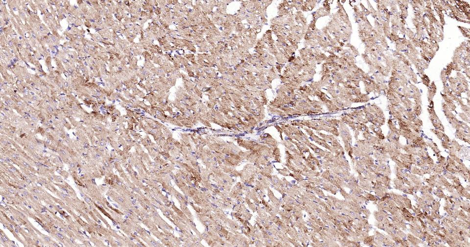 Paraformaldehyde-fixed, paraffin embedded Human Heart; Antigen retrieval by boiling in sodium citrate buffer (pH6.0) for 15 min; Antibody incubation with HSP60 Monoclonal Antibody, Unconjugated(bsm-61183R) at 1:200 overnight at 4°C, followed by conjugation to the SP Kit (Rabbit, SP-0023)and DAB (C-0010) staining.
