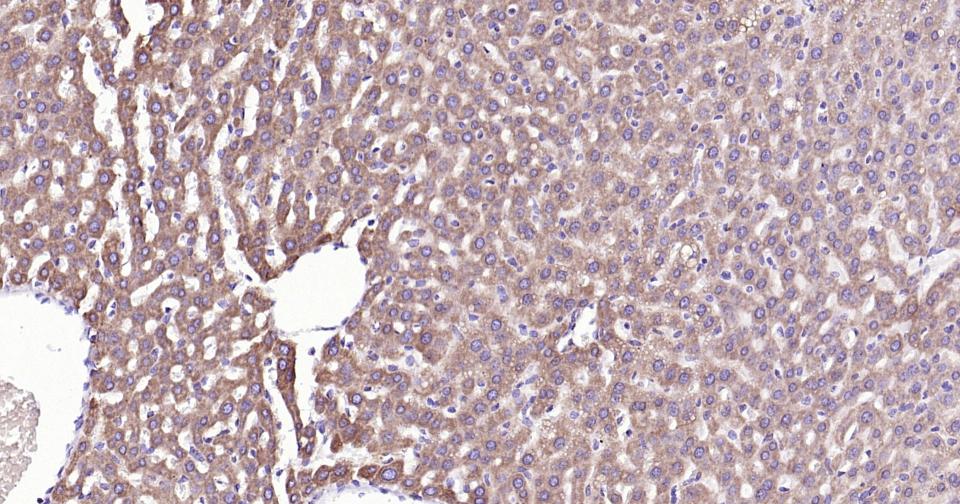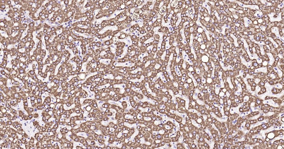 Paraformaldehyde-fixed, paraffin embedded Rat Liver; Antigen retrieval by boiling in sodium citrate buffer (pH6.0) for 15 min; Antibody incubation with HSP60 Monoclonal Antibody, Unconjugated(bsm-61183R) at 1:200 overnight at 4°C, followed by conjugation to the SP Kit (Rabbit, SP-0023)and DAB (C-0010) staining.