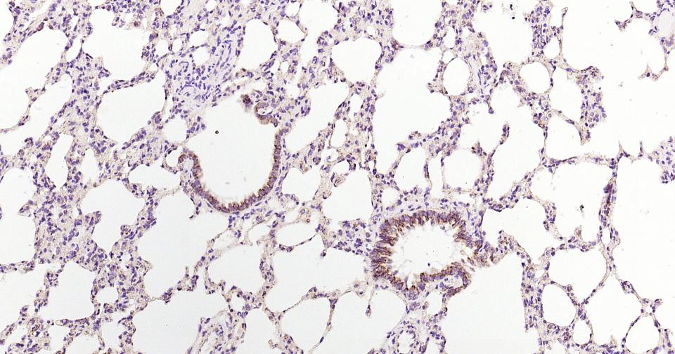 Paraformaldehyde-fixed, paraffin embedded Rat Lung; Antigen retrieval by boiling in sodium citrate buffer (pH6.0) for 15 min; Antibody incubation with HSP60 Monoclonal Antibody, Unconjugated(bsm-61183R) at 1:200 overnight at 4°C, followed by conjugation to the SP Kit (Rabbit, SP-0023)and DAB (C-0010) staining.
