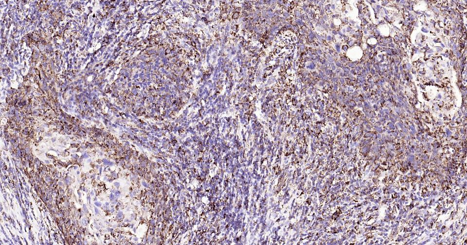 Paraformaldehyde-fixed, paraffin embedded Human Cervical Cancer; Antigen retrieval by boiling in sodium citrate buffer (pH6.0) for 15 min; Antibody incubation with HSP60 Monoclonal Antibody, Unconjugated(bsm-61183R) at 1:200 overnight at 4°C, followed by conjugation to the SP Kit (Rabbit, SP-0023)and DAB (C-0010) staining.