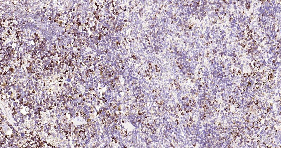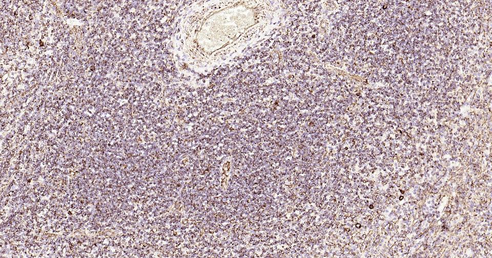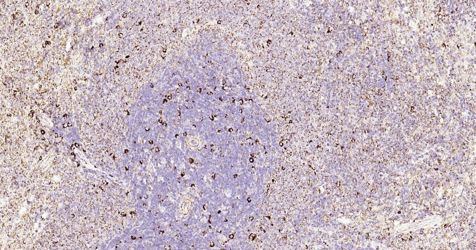 Paraformaldehyde-fixed, paraffin embedded Human Spleen; Antigen retrieval by boiling in sodium citrate buffer (pH6.0) for 15 min; Antibody incubation with HSP60 Monoclonal Antibody, Unconjugated(bsm-61183R) at 1:200 overnight at 4°C, followed by conjugation to the SP Kit (Rabbit, SP-0023)and DAB (C-0010) staining.