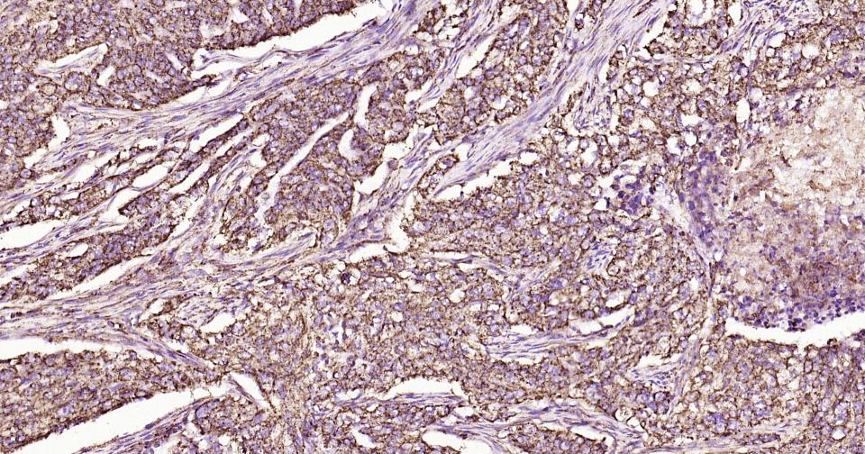 Paraformaldehyde-fixed, paraffin embedded Human Ovarian Cancer; Antigen retrieval by boiling in sodium citrate buffer (pH6.0) for 15 min; Antibody incubation with HSP60 Monoclonal Antibody, Unconjugated(bsm-61183R) at 1:200 overnight at 4°C, followed by conjugation to the SP Kit (Rabbit, SP-0023)and DAB (C-0010) staining.
