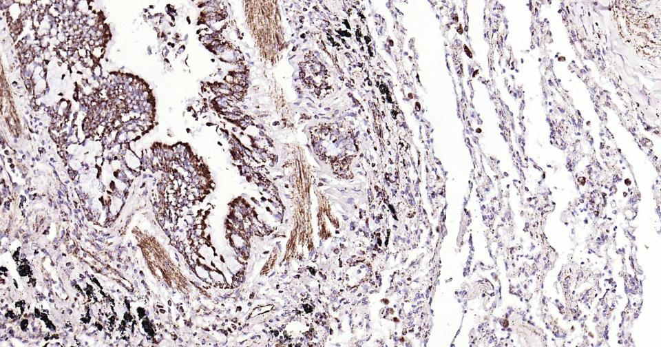 Paraformaldehyde-fixed, paraffin embedded Human Lung; Antigen retrieval by boiling in sodium citrate buffer (pH6.0) for 15 min; Antibody incubation with HSP60 Monoclonal Antibody, Unconjugated(bsm-61183R) at 1:200 overnight at 4°C, followed by conjugation to the SP Kit (Rabbit, SP-0023)and DAB (C-0010) staining.