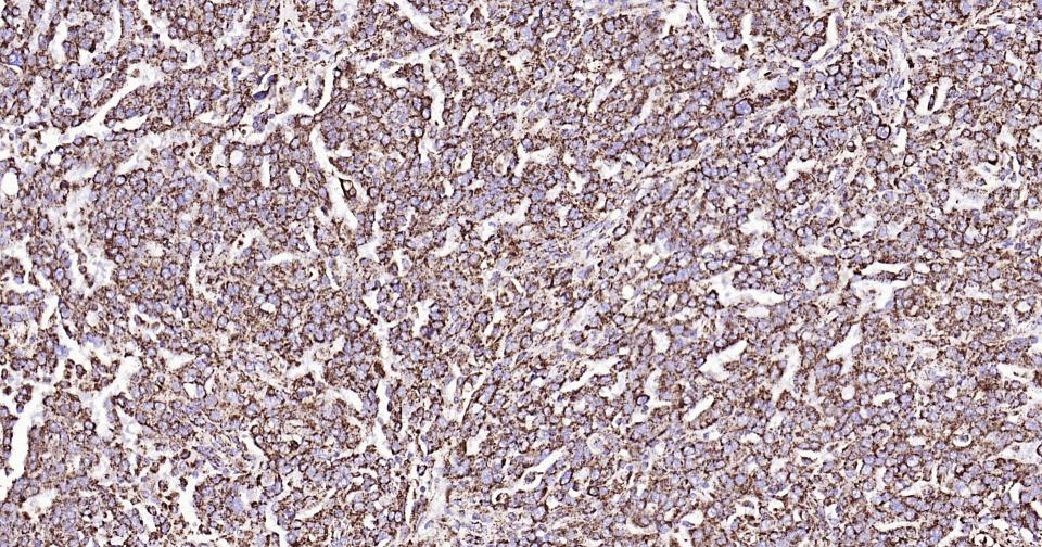 Paraformaldehyde-fixed, paraffin embedded Human Liver; Antigen retrieval by boiling in sodium citrate buffer (pH6.0) for 15 min; Antibody incubation with HSP60 Monoclonal Antibody, Unconjugated(bsm-61183R) at 1:200 overnight at 4°C, followed by conjugation to the SP Kit (Rabbit, SP-0023)and DAB (C-0010) staining.