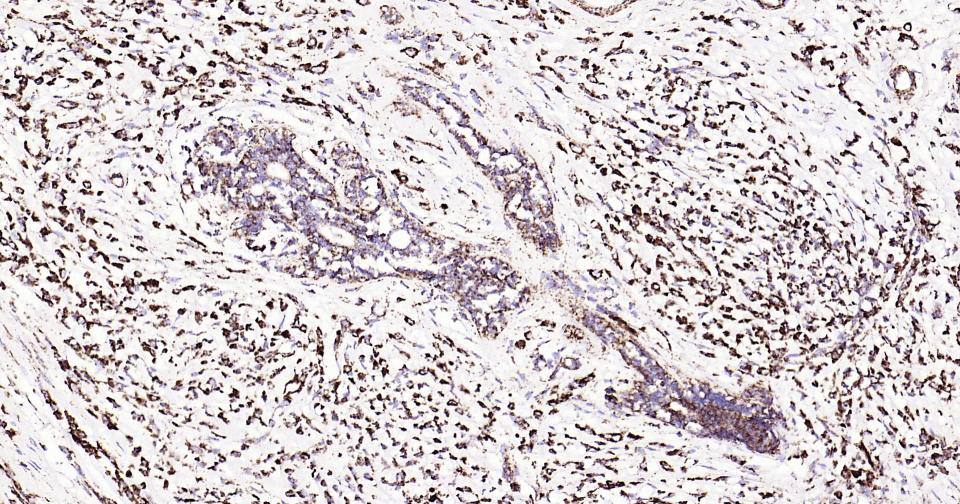 Paraformaldehyde-fixed, paraffin embedded Human Breast Cancer; Antigen retrieval by boiling in sodium citrate buffer (pH6.0) for 15 min; Antibody incubation with HSP60 Monoclonal Antibody, Unconjugated(bsm-61183R) at 1:200 overnight at 4°C, followed by conjugation to the SP Kit (Rabbit, SP-0023)and DAB (C-0010) staining.