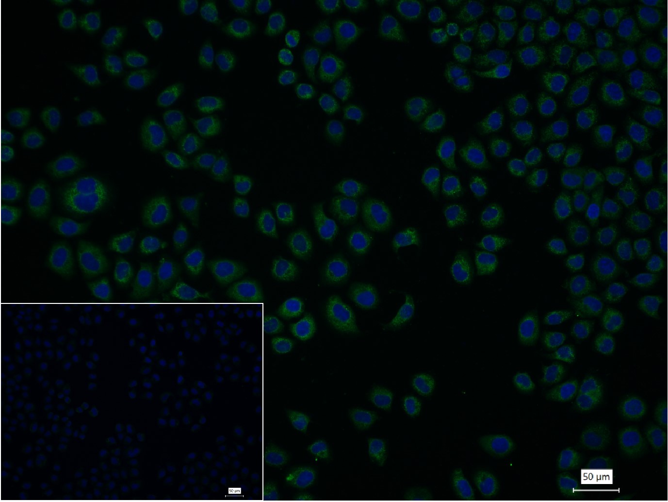 4% Paraformaldehyde-fixed Hela (H) cell; Triton X-100 at r.t. for 20 min; Antibody incubation with (HSP60) monoclonal Antibody, unconjugated (bsm-61183R) 1:100, 90 min at 37°C; followed by conjugated Goat Anti-Rabbit IgG antibody (green, bs-60295G-FITC) at 37°C for 90 min, DAPI (blue, C02-04002) was used to stain the cell nuclei. PBS instead of the primary antibody was used as the blank control.