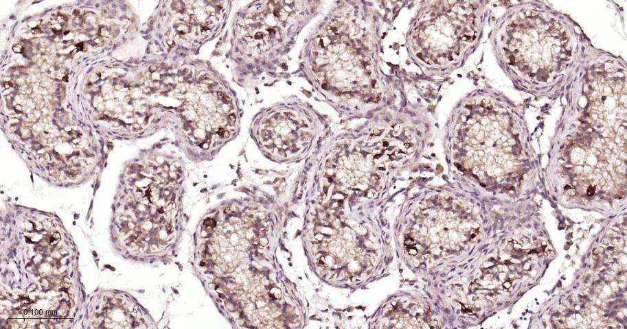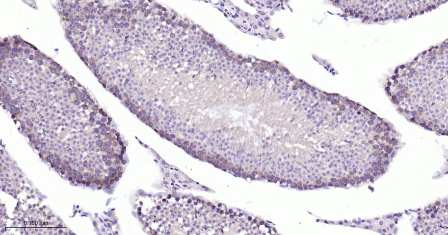 Paraformaldehyde-fixed, paraffin embedded Mouse Testicles; Antigen retrieval by boiling in sodium citrate buffer (pH6.0) for 15 min; Antibody incubation with Gamma Tubulin Monoclonal Antibody, Unconjugated(bsm-61186R) at 1:200 overnight at 4°C, followed by conjugation to the bs-0295G-HRP and DAB (C-0010) staining.