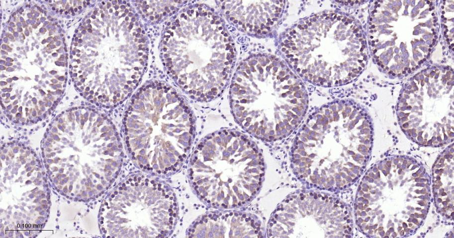 Paraformaldehyde-fixed, paraffin embedded Rat Testicles; Antigen retrieval by boiling in sodium citrate buffer (pH6.0) for 15 min; Antibody incubation with Gamma Tubulin Monoclonal Antibody, Unconjugated(bsm-61186R) at 1:200 overnight at 4°C, followed by conjugation to the bs-0295G-HRP and DAB (C-0010) staining.