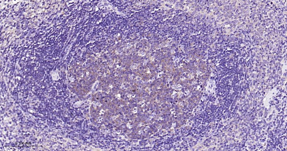 Paraformaldehyde-fixed, paraffin embedded Rat Spleen; Antigen retrieval by boiling in sodium citrate buffer (pH6.0) for 15 min; Antibody incubation with Gamma Tubulin Monoclonal Antibody, Unconjugated(bsm-61186R) at 1:200 overnight at 4°C, followed by conjugation to the bs-0295G-HRP and DAB (C-0010) staining.