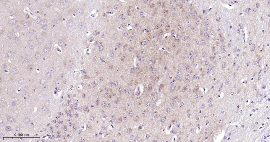 Paraformaldehyde-fixed, paraffin embedded Rat Cerebrum; Antigen retrieval by boiling in sodium citrate buffer (pH6.0) for 15 min; Antibody incubation with Gamma Tubulin Monoclonal Antibody, Unconjugated(bsm-61186R) at 1:200 overnight at 4°C, followed by conjugation to the bs-0295G-HRP and DAB (C-0010) staining.