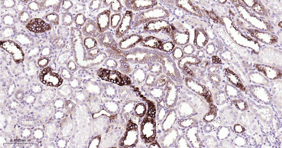 Paraformaldehyde-fixed, paraffin embedded Human Kidney; Antigen retrieval by boiling in sodium citrate buffer (pH6.0) for 15 min; Antibody incubation with Gamma Tubulin Monoclonal Antibody, Unconjugated(bsm-61186R) at 1:200 overnight at 4°C, followed by conjugation to the bs-0295G-HRP and DAB (C-0010) staining.