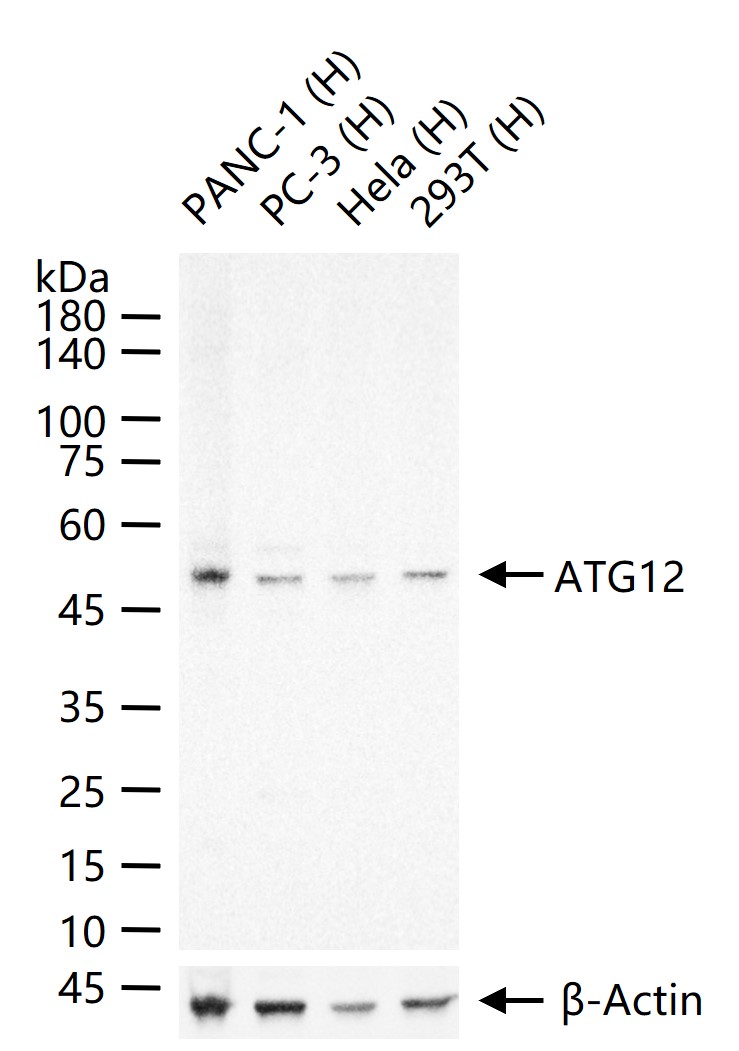 25 ug total protein per lane of various lysates (see on figure) probed with ATG12 monoclonal antibody, unconjugated (bsm-61199R) at 1:2000 dilution and 4°C overnight incubation. Followed by conjugated secondary antibody incubation at r.t. for 60 min.