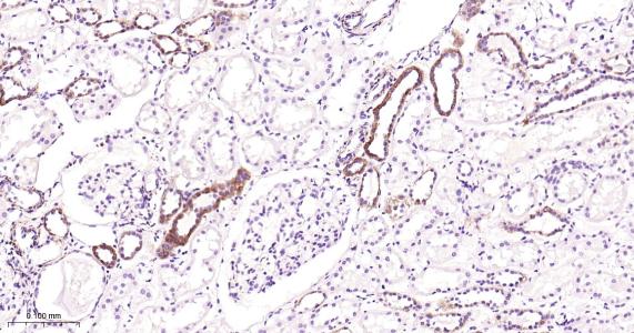 Paraformaldehyde-fixed, paraffin embedded Mouse Kidney; Antigen retrieval by boiling in sodium citrate buffer (pH6.0) for 15 min; Antibody incubation with Hexokinase 1 Monoclonal Antibody, Unconjugated(bsm-61212R) at 1:200 overnight at 4°C, followed by conjugation to the bs-0295G-HRP and DAB (C-0010) staining.