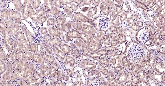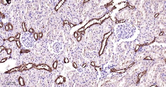 Paraformaldehyde-fixed, paraffin embedded Rat Kidney; Antigen retrieval by boiling in sodium citrate buffer (pH6.0) for 15 min; Antibody incubation with PBP Monoclonal Antibody, Unconjugated(bsm-61243R) at 1:200 overnight at 4°C, followed by conjugation to the bs-0295G-HRP and DAB (C-0010) staining.